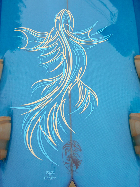 実は、これ、KEN THE FLATTOPさんのピンラインアートが施された、ECのファントム・オブ・アグア(QUAD)です。雑誌BLUEでの企画で使用されたボードなんです。中古ボードとして入荷したのですが、ボード自体もピンラインも魅力の、困った1本っが入荷しちゃったよって訳です。じゃあCHECK!!
