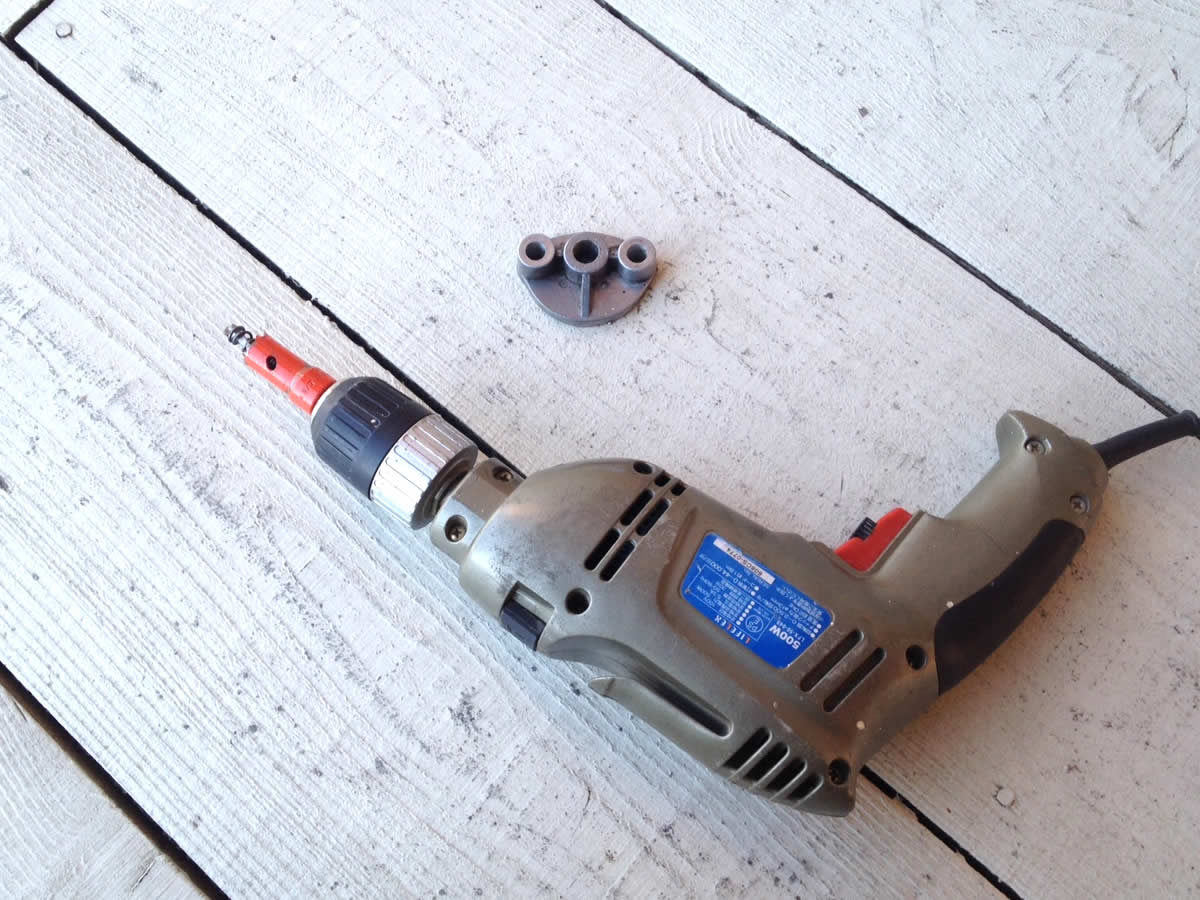 作業がやり易い様に、木の板にフューエルブロックオフプレートをコースレッドで固定し穴開けです。