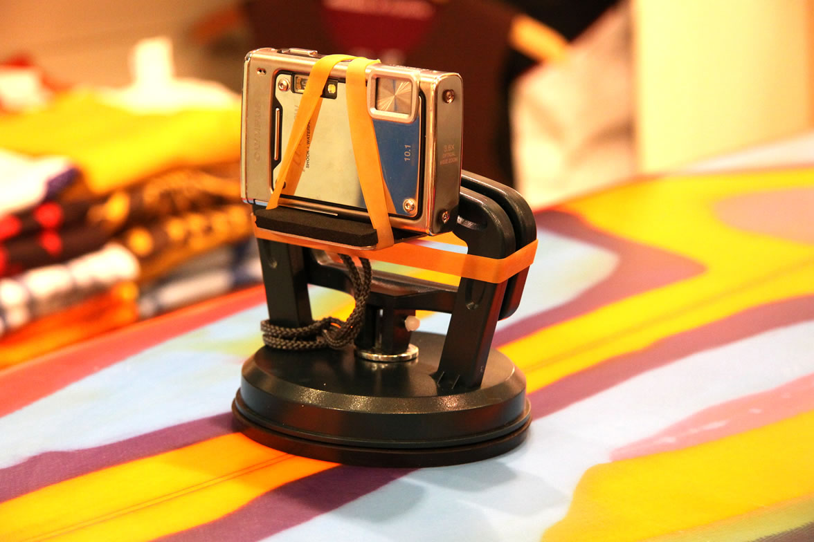 重いガラス等を移動するのに使用する、巨大吸盤(バキュームリフター)と、ステンレスのステー、カメラとステーの間のスポンジシート、それと、ビスで構成された、非常にシンプルなつくりです。制作費だって、2,000円程度で済みました。