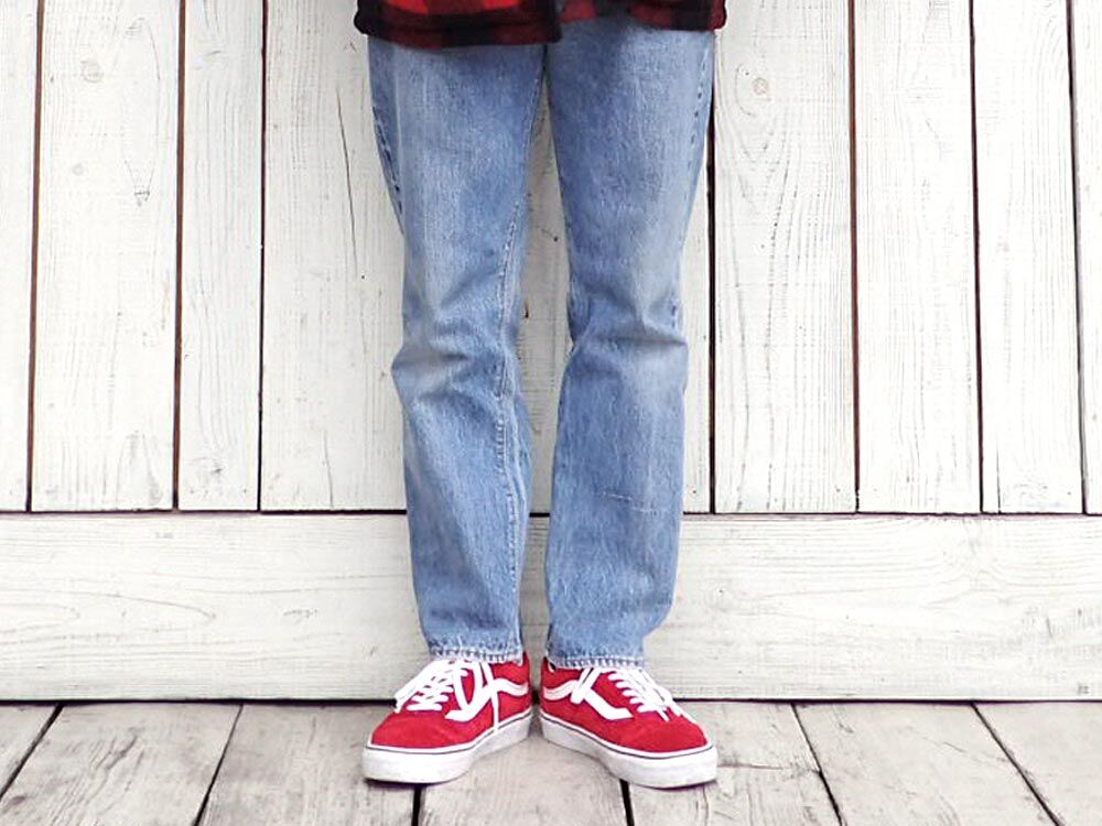 小物とスニーカーとボーダーのレッド系で